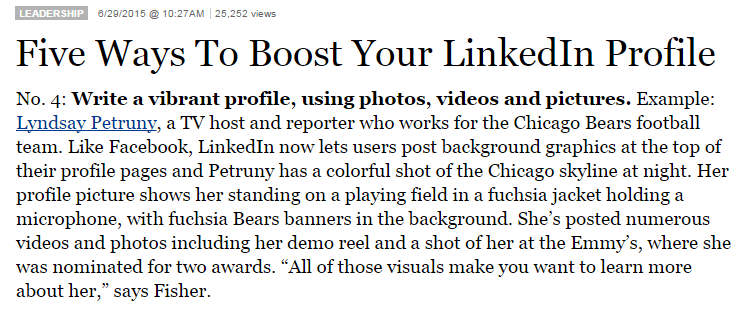 Lyndsay’s profile was chosen by LinkedIn in its efforts to feature members who have uploaded unique rich media to enhance their profiles and inspire other members to do the same. She shared what inspired her to upload visual content to her LinkedIn profile, how uploading visual content to her profile has helped her in her career, and tips for other LinkedIn members.