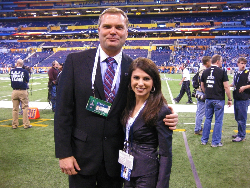 On the field at Super Bowl XLVI with Brian Lowe and Kraft Sports Productions' Nick